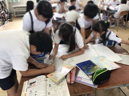 社会では、「産地」の学習をしています。グループで白地図にたくさん書き込んでいました。