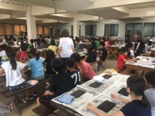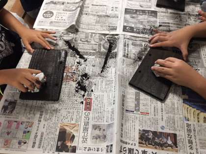 焼き板工作中です。説明をしっかり聞いて、板をゴシゴシ磨きましょう。
