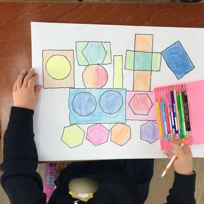 四角や丸の箱の形をかたどって、記者やお花、ロボットを描きました。