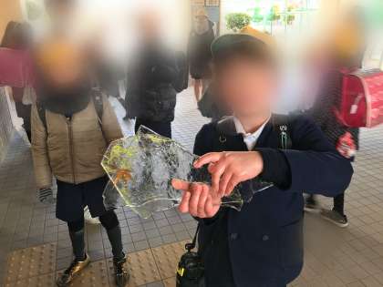 金曜日の朝はとても寒く、近所で見つけた氷を持ってきた子ども達にも出会いました。