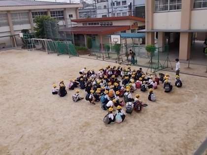 運動場に集合後、4年生は元気よく『大阪市立科学館』へ出かけていきました。