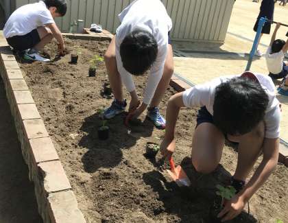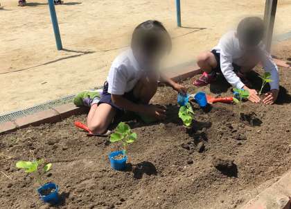 ヘチマとひょうたんの苗を植えました。これから、水やりをしながら、観察学習を行なっていきます。