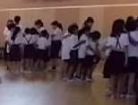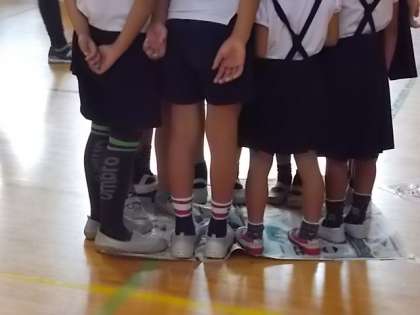 1学期最後の児童集会は、グループ対抗で『新聞のりゲーム』をしました。グループが協力し合って、1枚の新聞の上にのりました。