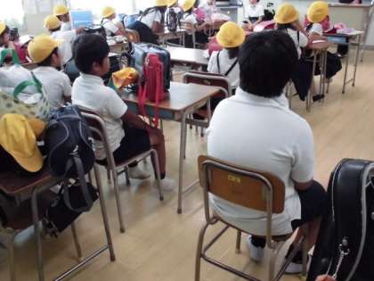 5時間目に台風時の集団下校を行いました。地区別の教室に集まった後、グループごとに下校しました。