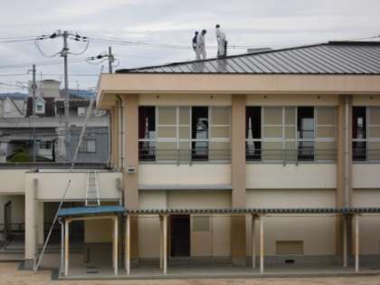 今日、先日の台風で破損した講堂の屋根の応急修理が、行われました。これで、雨漏りがなくなります。
