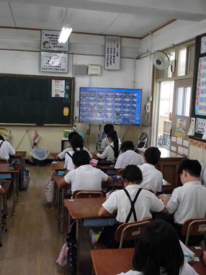 1学期に使ったタブレットPCの使い方を復習しました。大画面に自分の作った作品が、表示され喜んでいました。