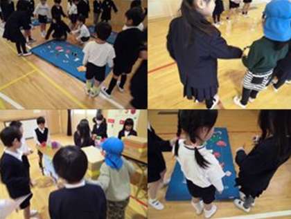 2時間目に、『加美第1保育所』と『加美東幼稚園』の子どもたちが、小学校にやってきました。講堂で各ブースごとに、1年生の児童が考えたゲームを一緒にしました。