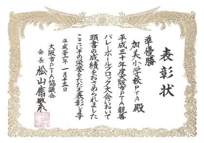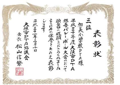 2月10日の大阪市PTA親善バレーボール大会においては、第3位の成績でした。