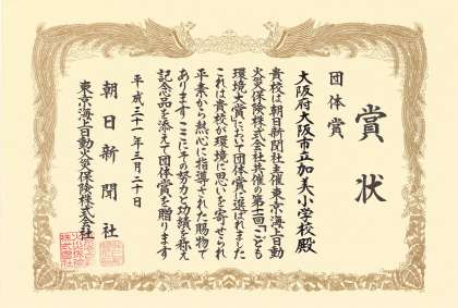 6年生の児童が応募した「子ども環境大賞」にて、団体賞を受賞しました。賞状と副賞をもらいました。