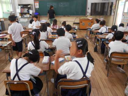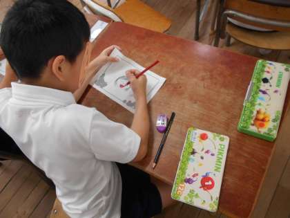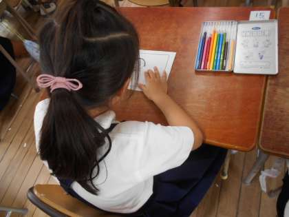 1年2組では、実習生が栄養指導の授業をしてくれました。その先生にありがとうの手紙を書いています。一生懸命似顔絵もかいています。