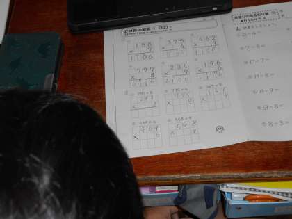 かけ算のひっ算プリントの答え合わせをしています。係の人がしっかりと進めてくれていました。