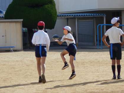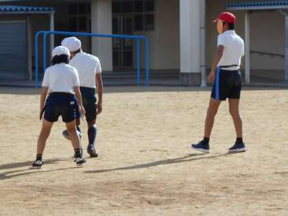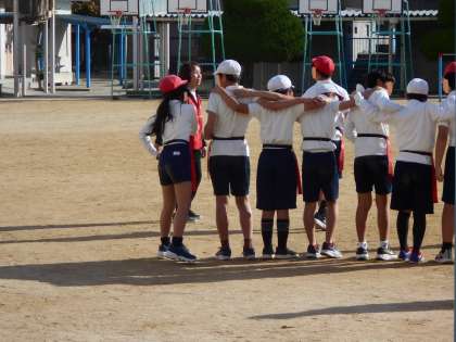 タグラグビーをしています。友だちと楽しそうにパス練習を行いました。