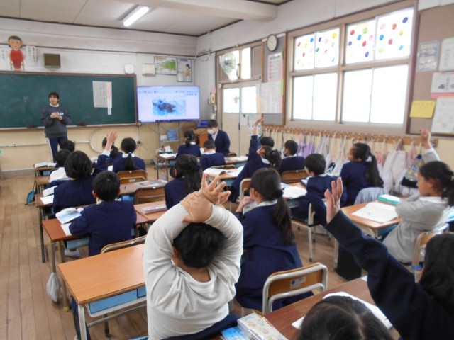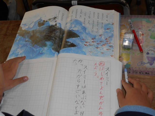 「スイミー」の学習です。先生の質問をしっかりと聞き手を挙げて答えていました。