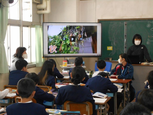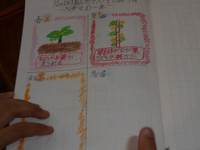 1年通してのヘチマの様子をDVDで見ながら、ノートにまとめています。