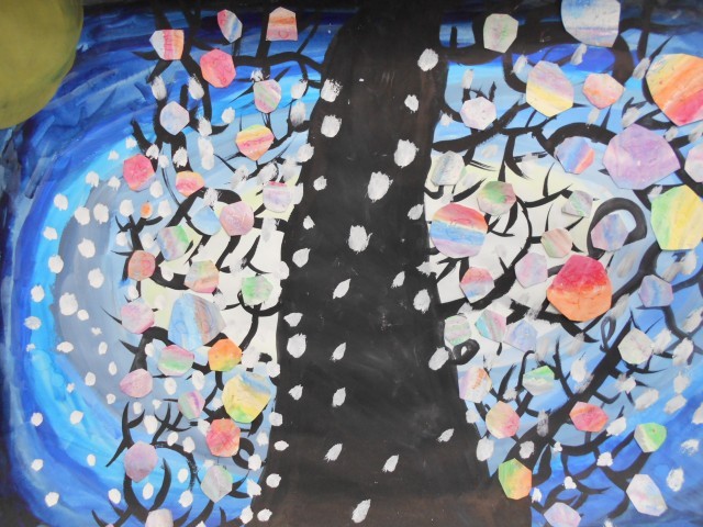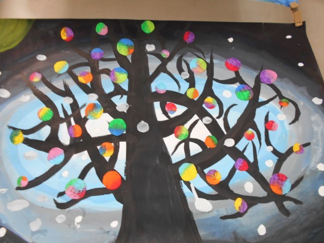 「もちもちの木」きれいな色とりどりの絵が掲示されています。