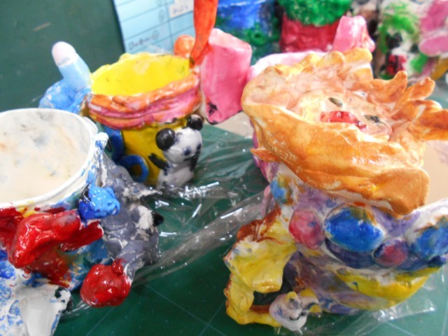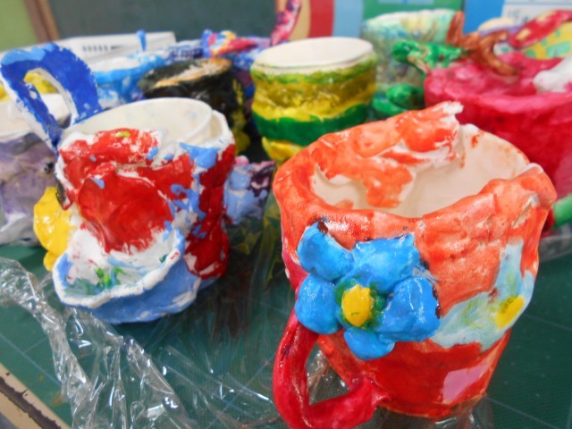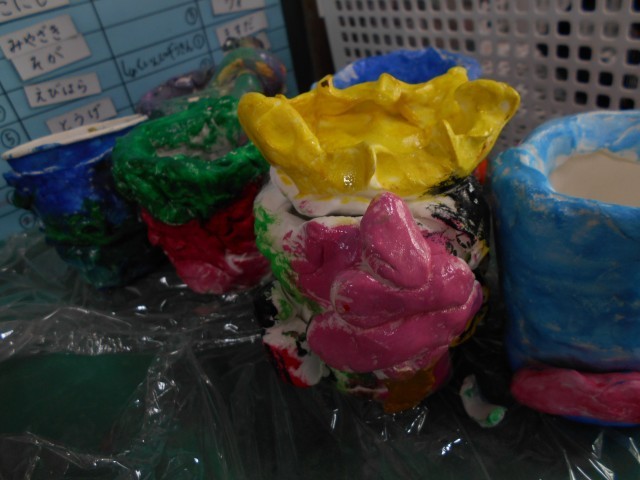 2年生の図工の作品です。ペン立てを紙粘土で作って色をつけニスを塗っています。