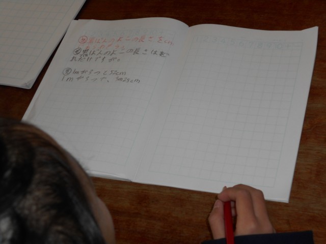 「長さ」の学習です。今日は黒板横の長さをはかっています。