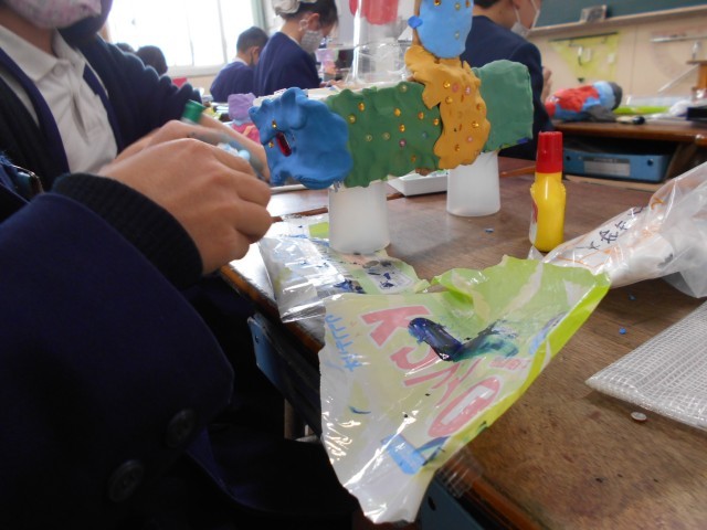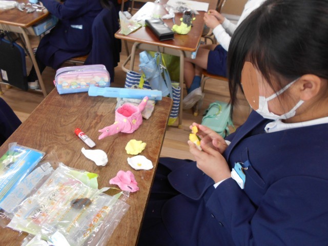 紙コップやペットボトルに紙粘土をくっつけて作品作りをしています。自分でもってきたビーズなども使って個性あふれる作品ができあがっています。