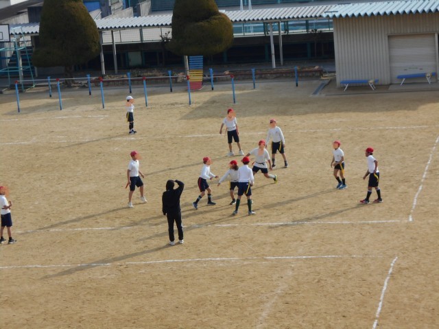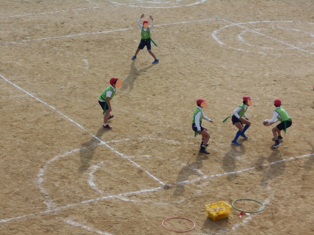 タグラグビーをしています。5年生の子どもたちは元気いっぱい駆け回っていました。