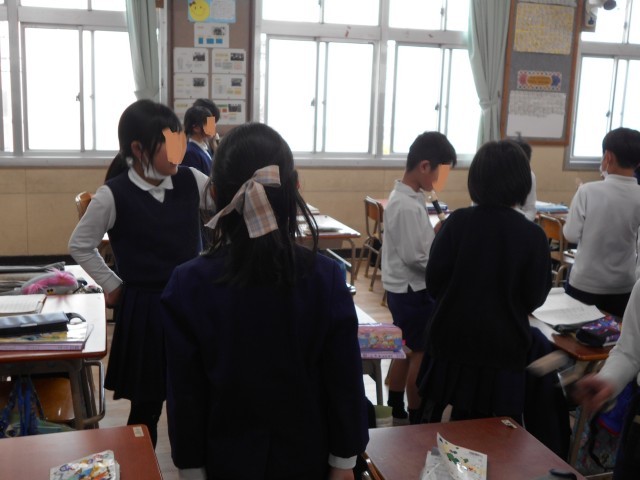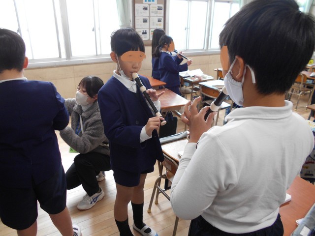 音楽です。リコーダーの練習をペアで行っています。3年生ではじまったリコーダーも随分上手になりました。