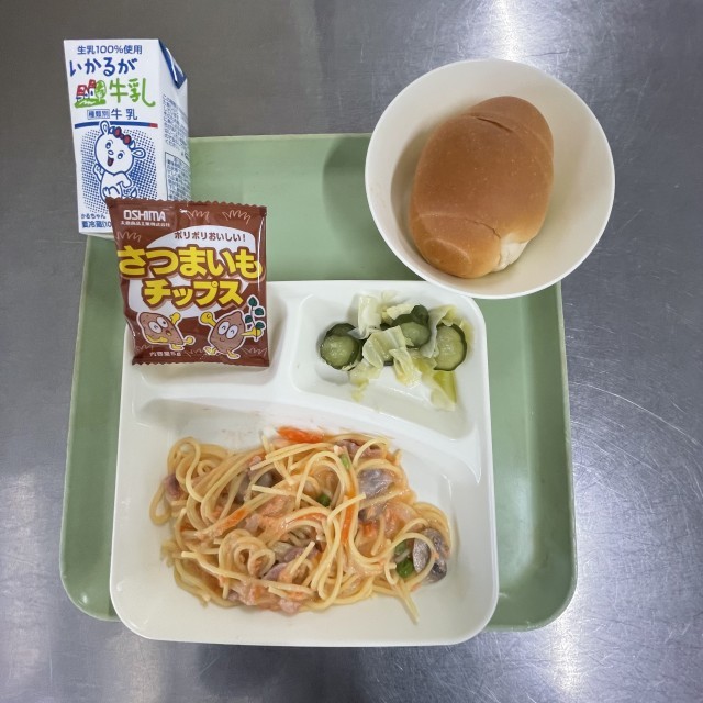 献立は○さけのスパゲッティ○キャベツときゅうりのサラダ○おさつチップス○ミニコッ...