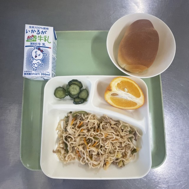 献立は○焼きそば○きゅうりのしょうがづけ○あまなつかん〈和歌山県産〉○ミニコッペ...