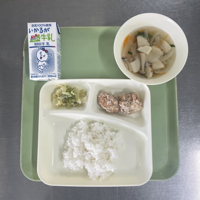献立は○鶏肉のたつたあげ○五目汁○キャベツの梅風味○ごはん○牛乳でした。