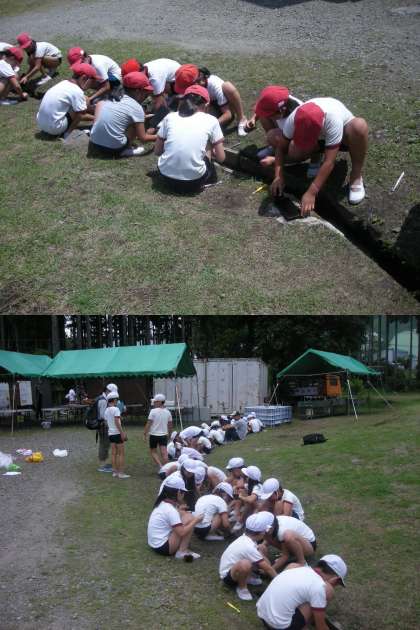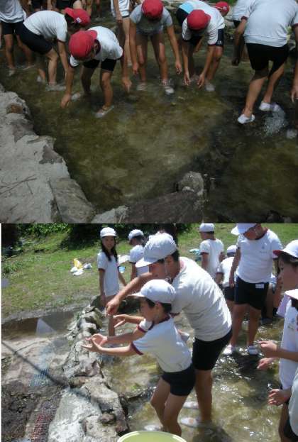 避難訓練後、体験活動(魚つかみ、焼き板みがき)を行いました。