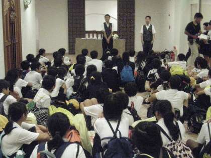 入館式(学校長・児童代表のあいさつ、宿舎の方からの話)の様子です。「お世話になります。よろしくお願いします。」