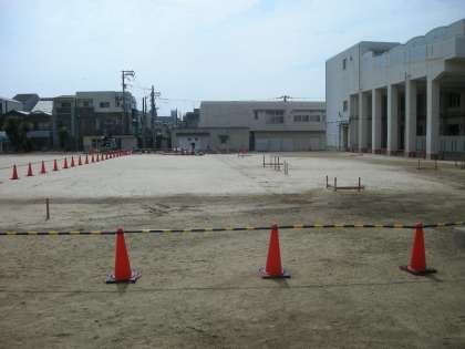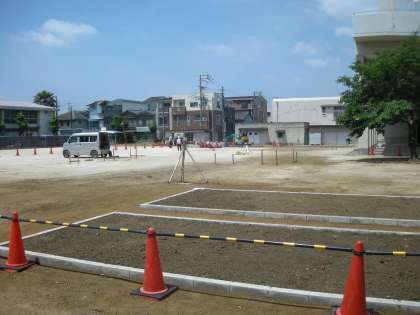仮設校舎の配置検査が行われました。いよいよ本格的に、仮設校舎建設が始まります。