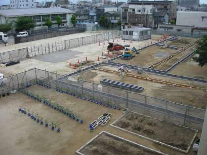 仮設校舎の基礎工事が終了しました。いよいよ、仮設校舎の組み立てが始まります。