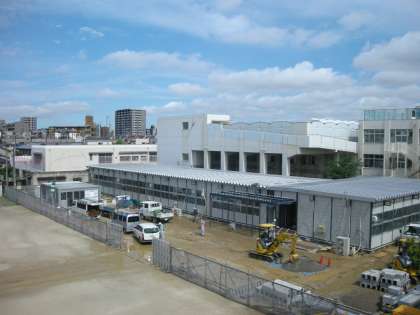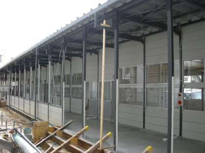 仮設校舎建設が仕上げの段階に入りました。