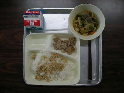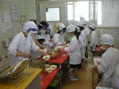 3年生の皆さんは、教育実習生の方と一緒に、うれしそうに給食の配膳を行っていました。