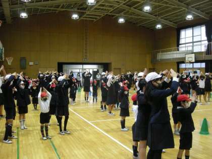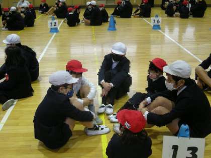 6年生が1年生をやさしくリードして、クリスマスソングが流れる中、「クリスマスクイズ」を楽しみました。クリスマス・イブ当日とあって、皆さんのにこやかな笑顔があふれていました。赤帽が1年、白帽が6年です。