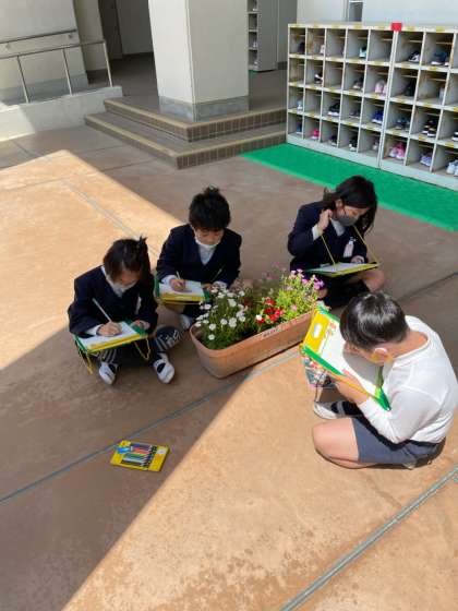 2年生が生活科の学習で花の観察を行いました。暖かな日差しのもと、一生懸命にスケッチしていました。