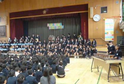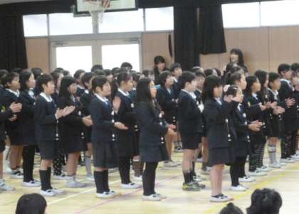 卒業式を19日にひかえ、5日に「6年生を送る会」を開きました。まず、たてわり班で1年生から5年生の子どもたちが書いた色紙を6年生に贈りました。その後、1年生から順に、お祝いと感謝の気持ちを込めて歌やリコーダー合奏を発表しました。(左の写真は4年生の発表の様子です)6年生からはお礼に子どもたちに手縫いの雑巾がプレゼントされ、「君をのせて」の合奏を発表しました(写真右)。リズミカルで迫力ある演奏でした。6年生には、本校での6年間を思い出しつつ、卒業までの残された日を大切に過ごしてほしいと思います。