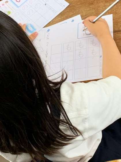 「も」は、今までに習った「し」という文字に似ている部分があることを意識して、子どもたちは書いていきます。