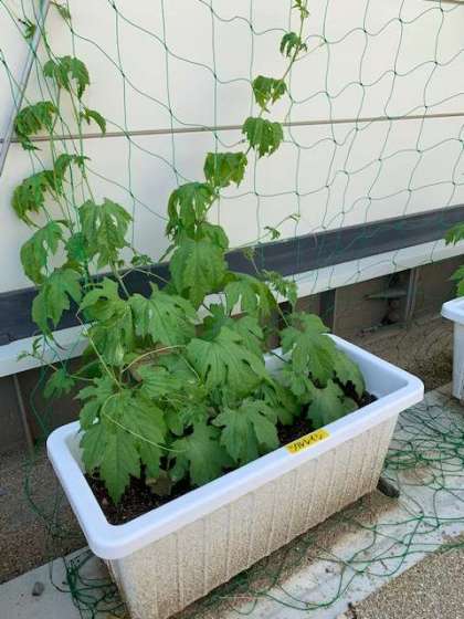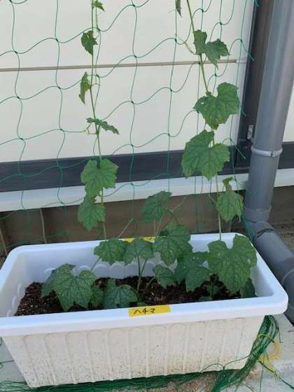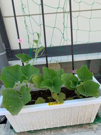 仮設職員室の裏で、「ヘチマ」「ヒョウタン」「ツルレイシ」を育ててグリーンカーテンにしようと取り組んでいます。子どもたちも何月何日でどこまで伸びたのかを観察しています。