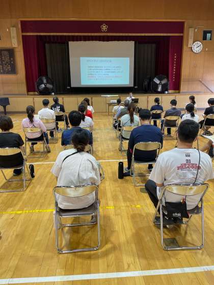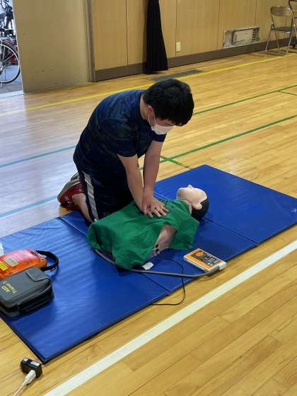 6月1日(火)の放課後、教職員が救命救急講習を受講しました。毎年、プール水泳が始まる前に「AEDを使用した心肺蘇生法」の手順を確認し、実習を行っています。