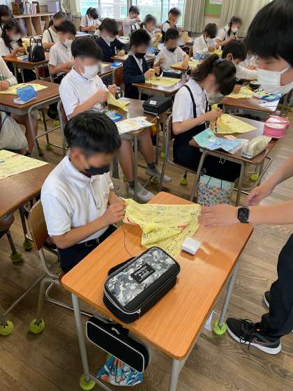裁縫道具と練習用布を使って、ボタン付けの練習をしました。
