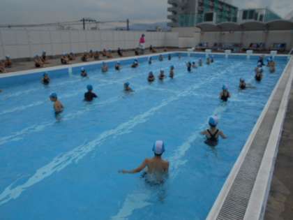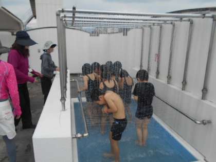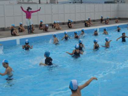 シャワーを浴びて入水するときは、硬い表情の児童もいましたが、しだいに表情もほぐれ、水遊びを楽しみました。