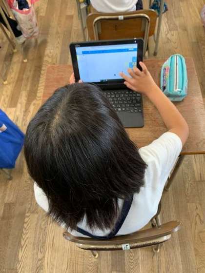指で名前を書いたり、デザインしたものを担任にタブレットを使って提出を試みます。