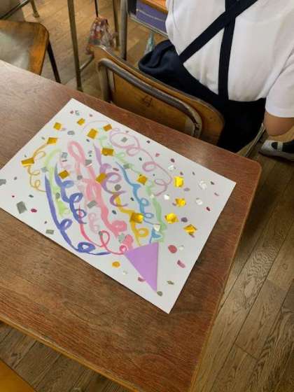 「クラッカーをつくろう」と絵の具と折り紙を使って、画用紙にそれぞれのクラッカーをつくりあげていきます。