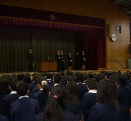 校長先生のお話のあと、今年来られた先生方を紹介しました。そのあと、新しい担任の先生が発表されました。