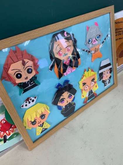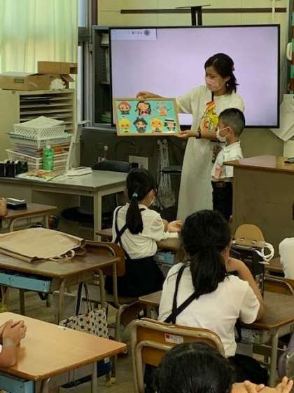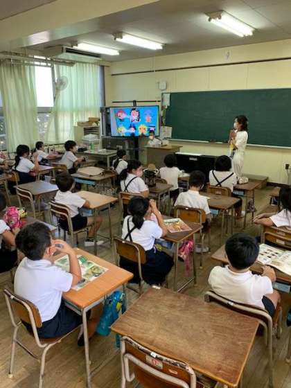 あるクラスでは、夏休みの作品について発表していました。画面に大きく映して、どんなところを工夫したのか、みんなを前にして報告します。力作揃いです。