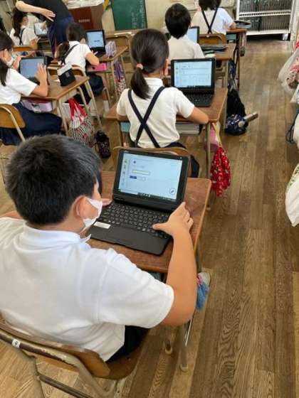 1人1台の端末を活用して、算数科で「デジタルドリル」に取り組みました。自分でログインして問題を解くことができるように、今、学校で練習しています。