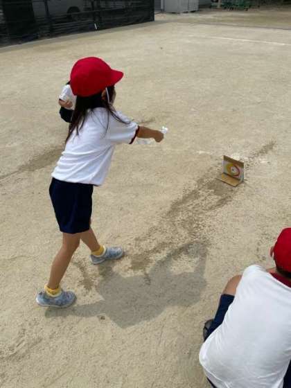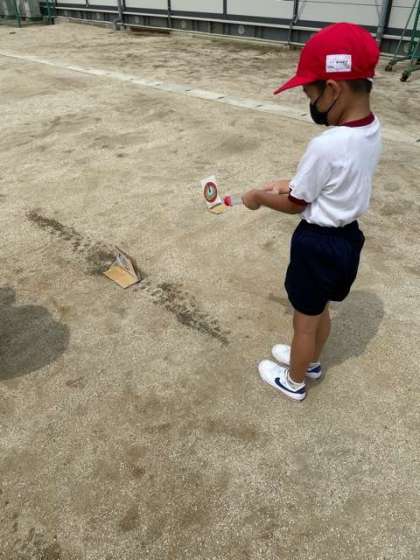 教室で作った「まと」を運動場に並べて、家から持ってきたケチャップ等のチューブで、水鉄砲あそびをしました。暑さを忘れて、みんな夢中になって遊んでいました。