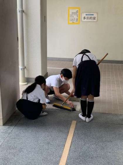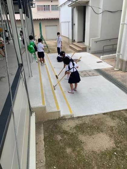 子どもたちは、自分の担当場所と担当道具を使って協力して取り組んでいます。ゴミを集めるのも、どの場所に集め、ちりとりで取るのか相談しながら進めています。