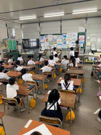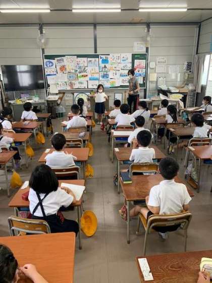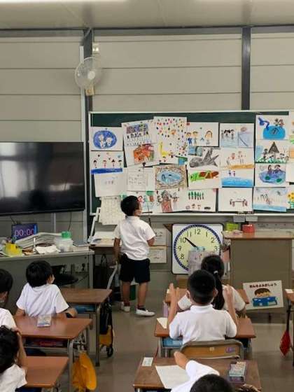 一年生のあるクラスでは、夏休みにあった出来事を、絵と文に表しました。今日は、文をみんなの前で読んで、前に貼っているどの絵が読んだ人の絵かを考えていきます。