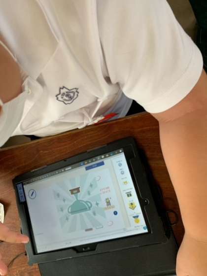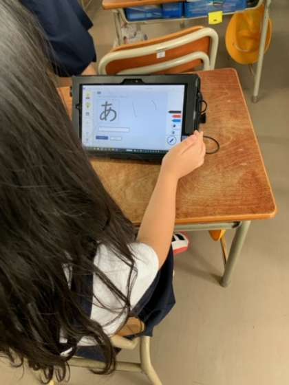 習った文字が、上手に書けるか、タブレットで挑戦です。タッチペンの反応もあまりよくなく、その他のことでも、1年生には、とても難しいようです。教職員が3人がかりでフォローに入ります。